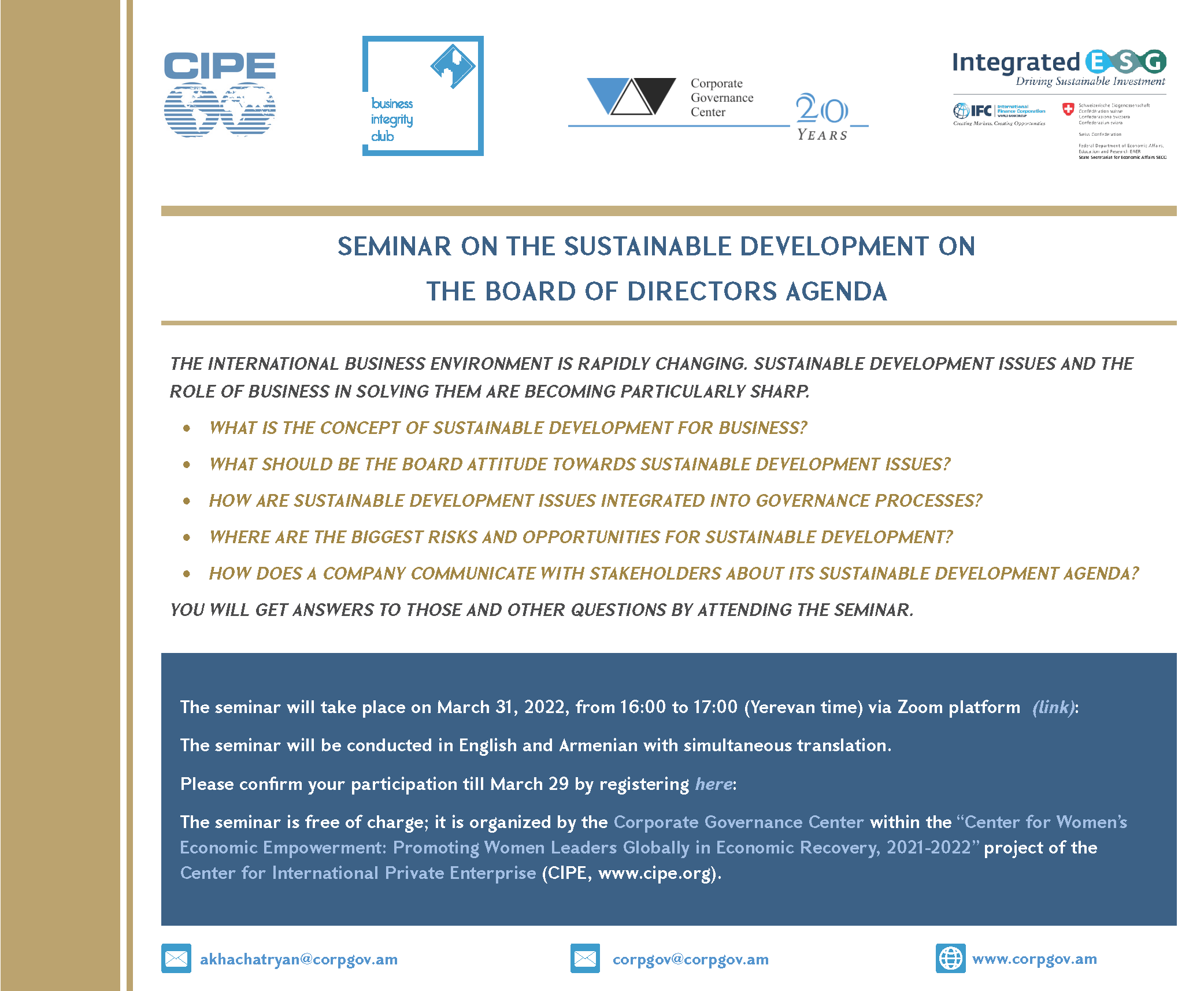 The seminar is free of charge; it is organized by the Corporate Governance Center within the “Center for Women’s Economic Empowerment: Promoting Women Leaders Globally in Economic Recovery, 2021-2022” project of the Center for International Private Enterprise (CIPE, www.cipe.org).