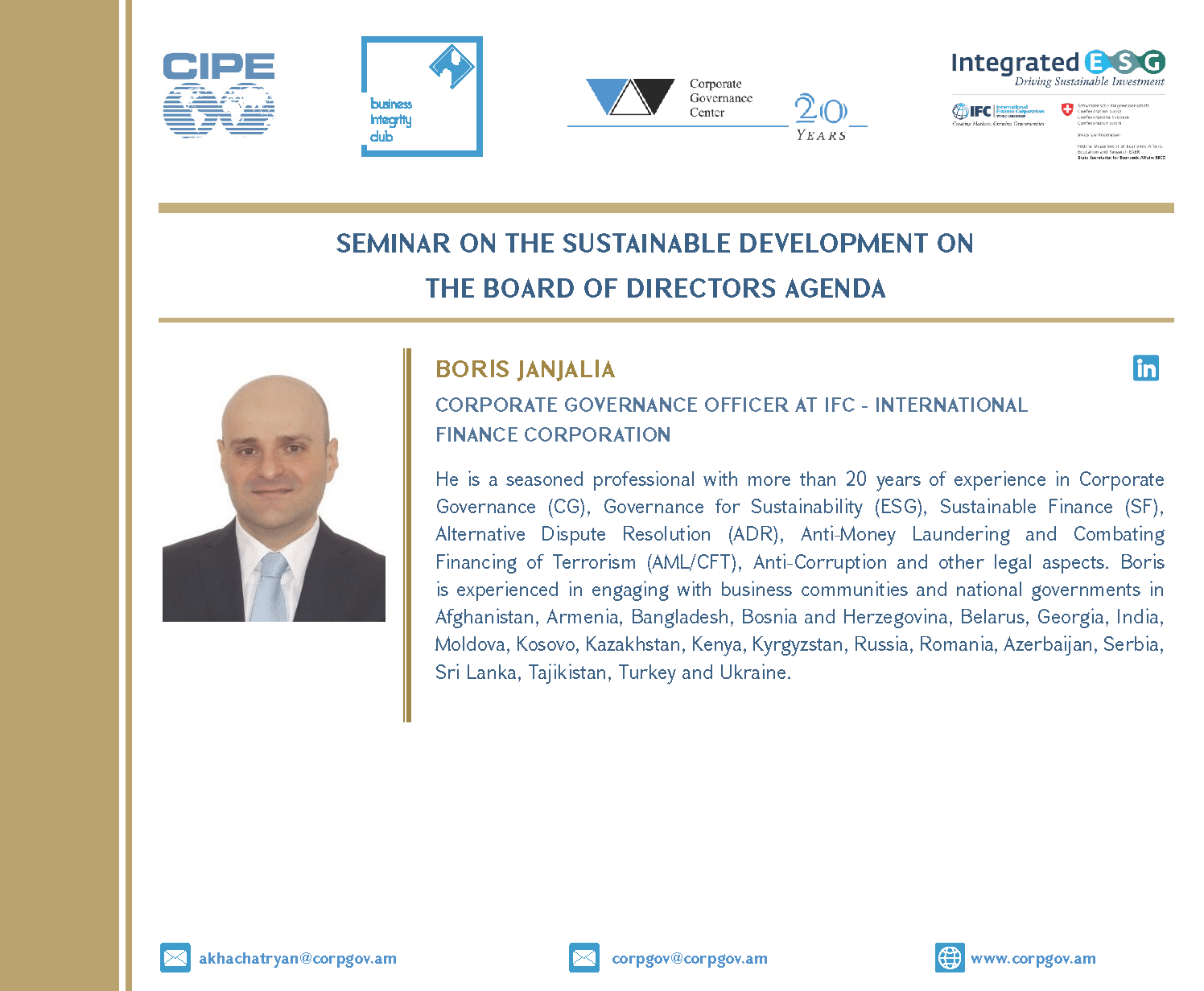 The seminar will be conducted by Boris Janjalia, IFC Corporate Governance Officer.
