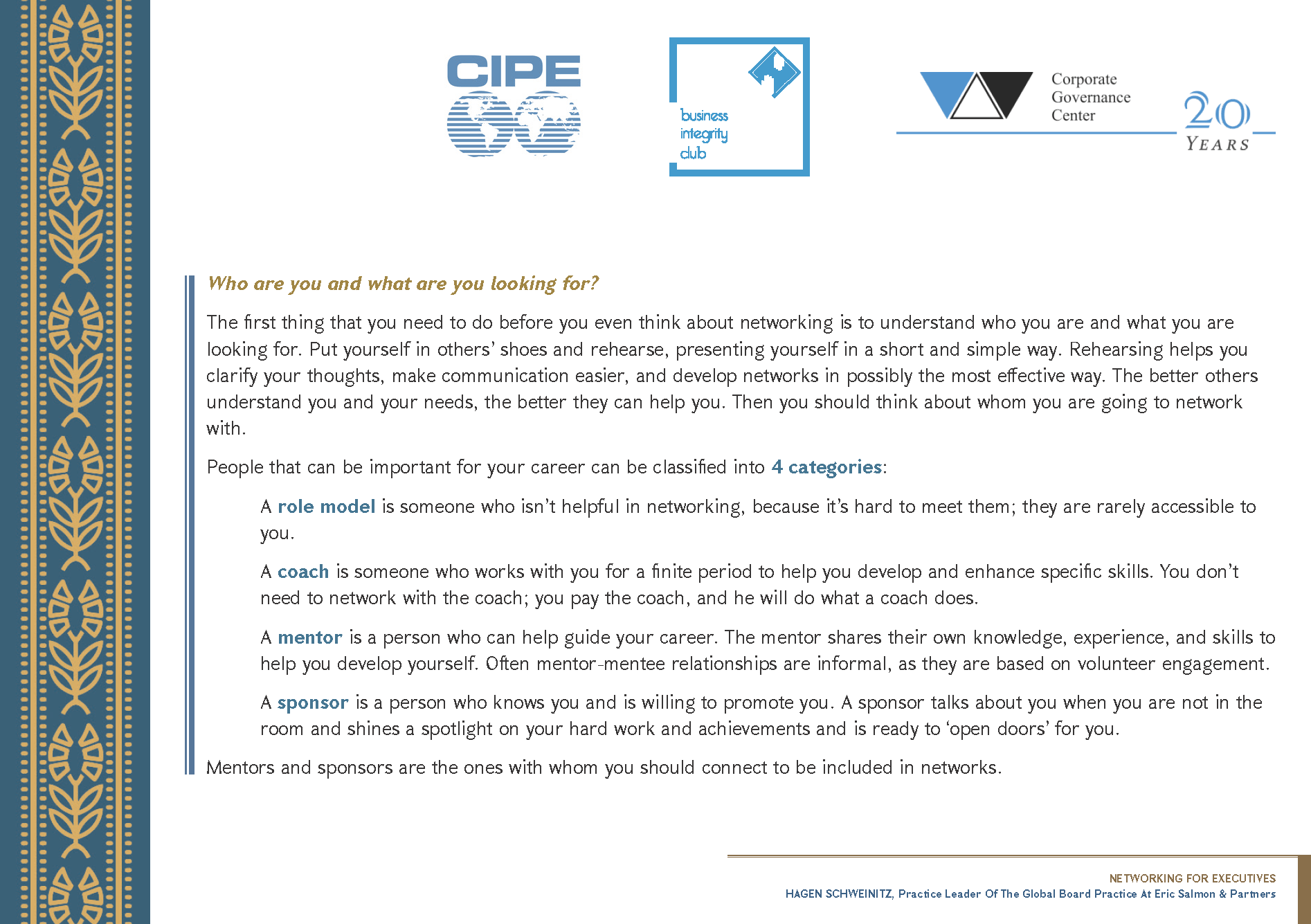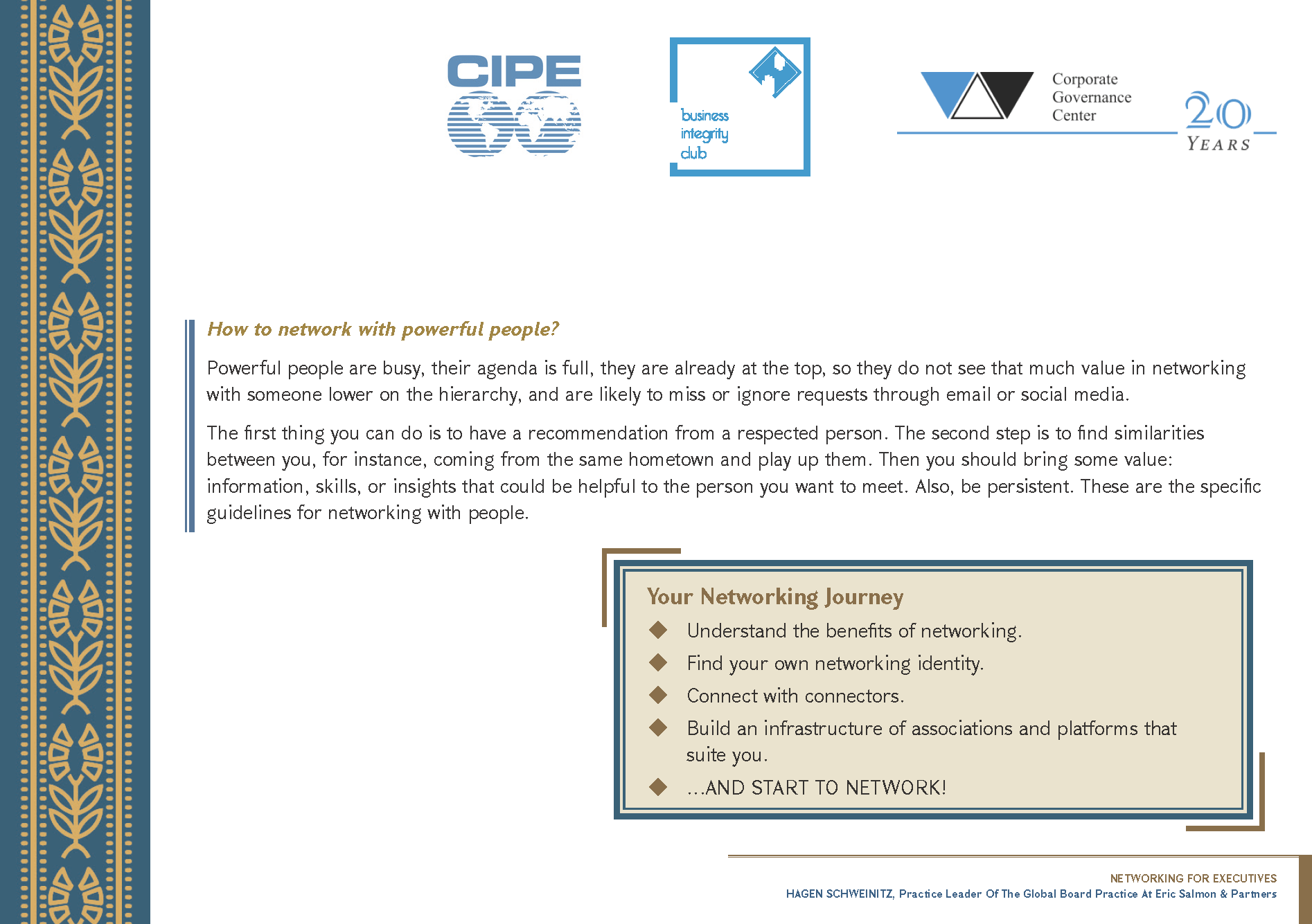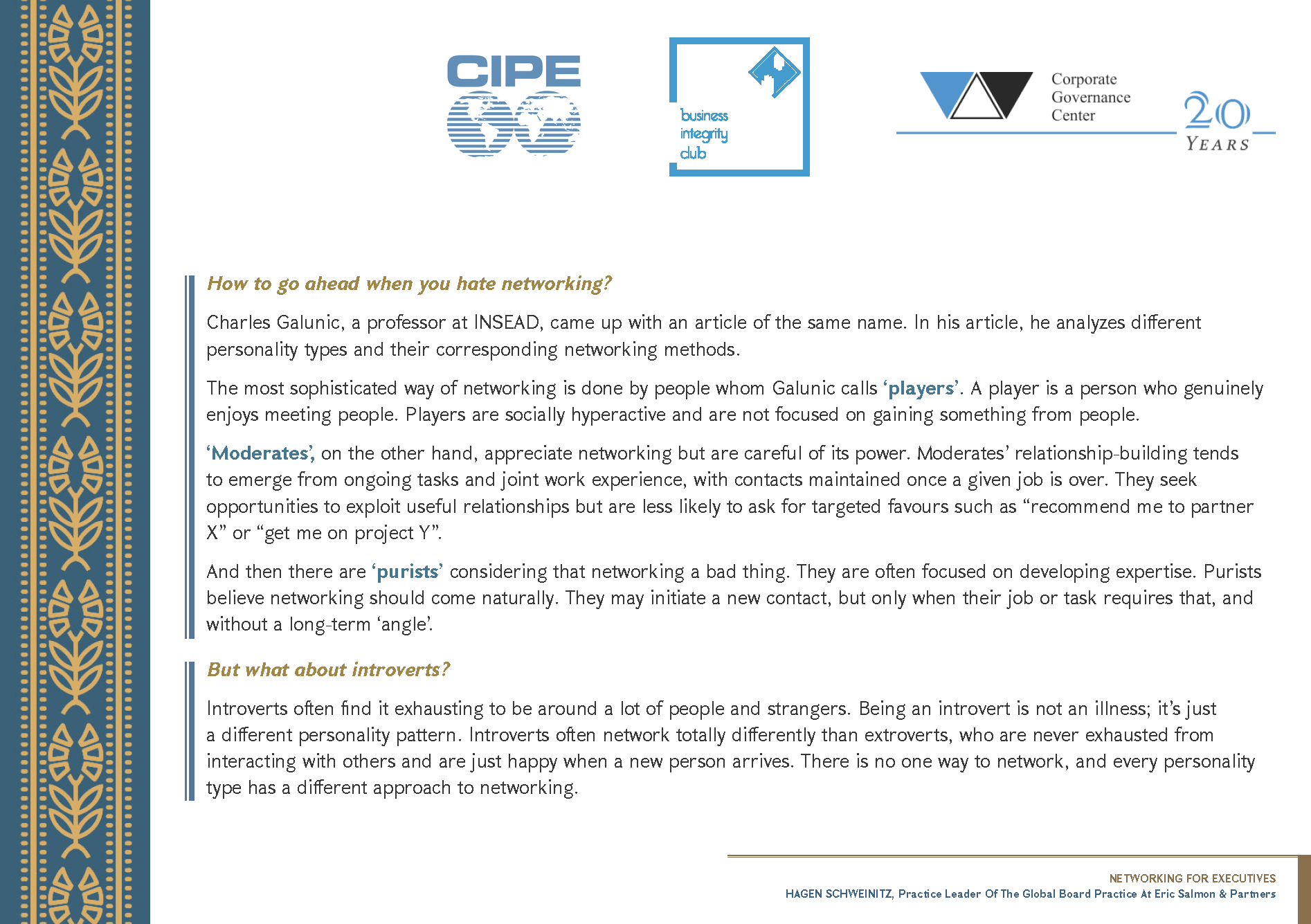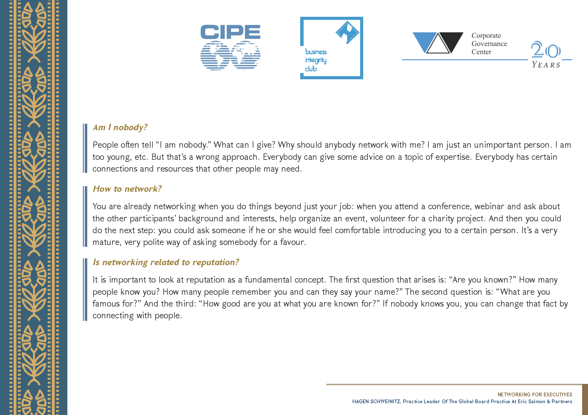 15 июля 2022 года Центр Корпоративного Управления организовал мастер-класс на тему «Нетворкинг для руководителей», который провел Хаген Швайниц, руководитель глобальной практики работы советов директоров в международной консалтинговой компании по лидерству и управлению Eric Salmon & Partners.