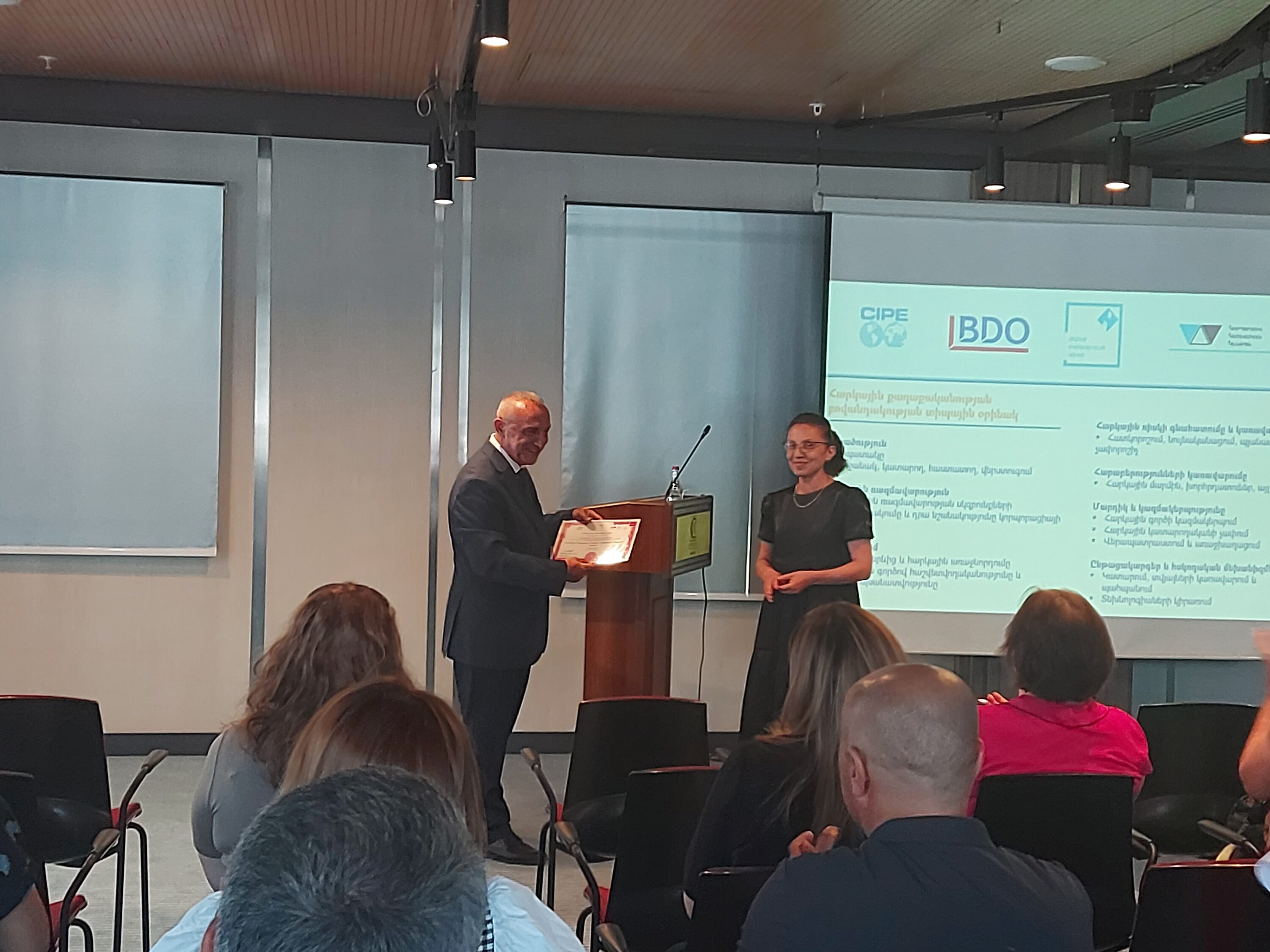 В завершение мероприятия, по случаю 20-летия Центра Корпоративного Управления, Агарону Чилингаряну был передан сертификат благодарности за поддержку деятельности Центра, а также вклад в развитие среды корпоративного управления в Армения.